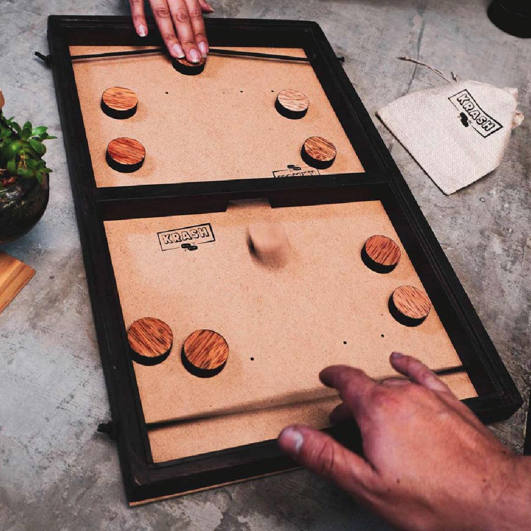 ¿Listo para poner a prueba tu velocidad y reflejos? Krash es la nueva versión de ese clásico juego de hockey que siempre encontrabas en las salas de arcade, pero ahora… ¡en tu mesa! Usa las bandas elásticas para disparar tus discos por el túnel, esquiva, apunta y vacía tu campo antes que tu oponente. ¿Y lo mejor? Cuando no estás jugando, puedes colgarlo como un cuadro decorativo en tu pared. Sí, Krash también tiene flow.