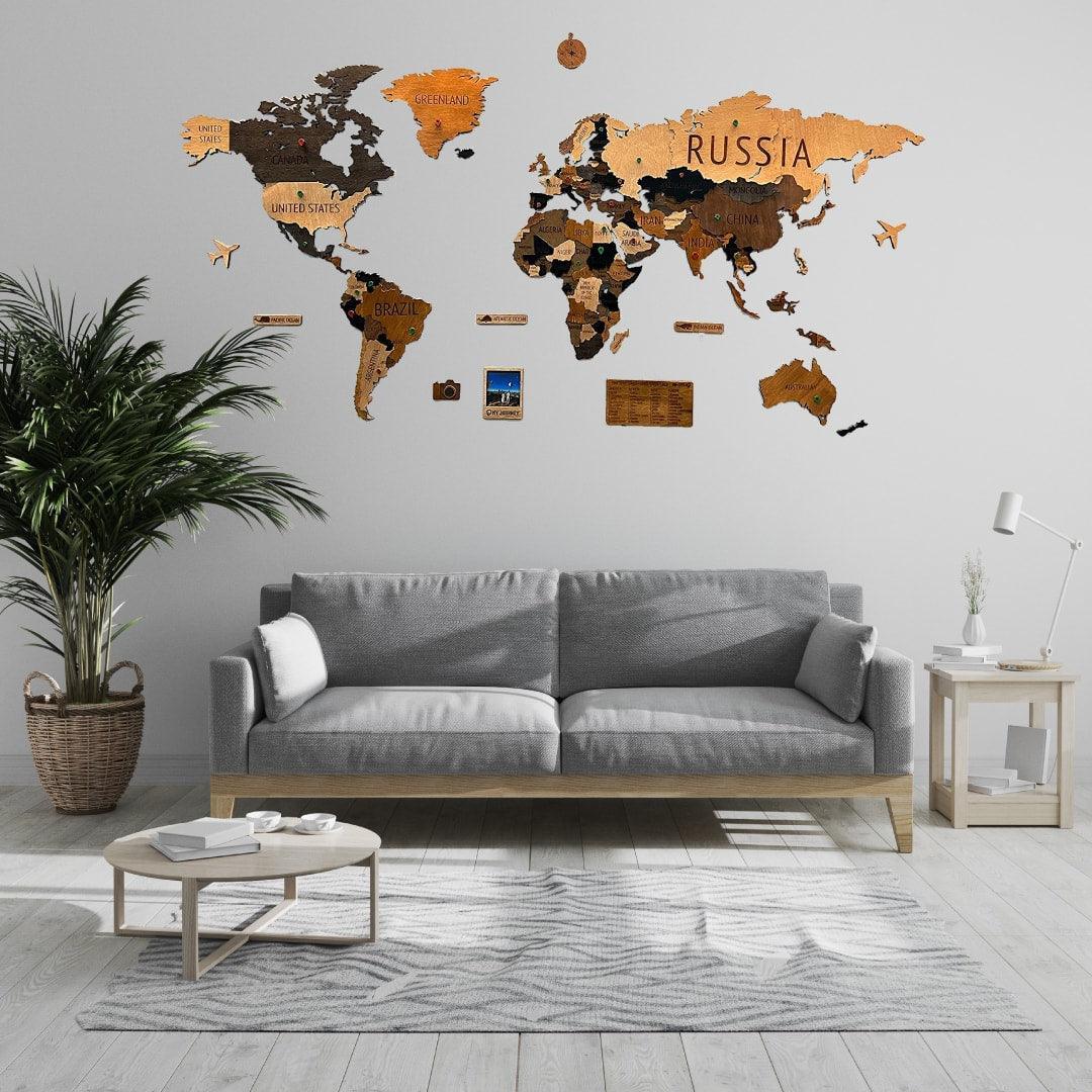 MADEMAP Premium - Mapamundi de Madera para Instalar en Pared en Relieve 3D Multicolor